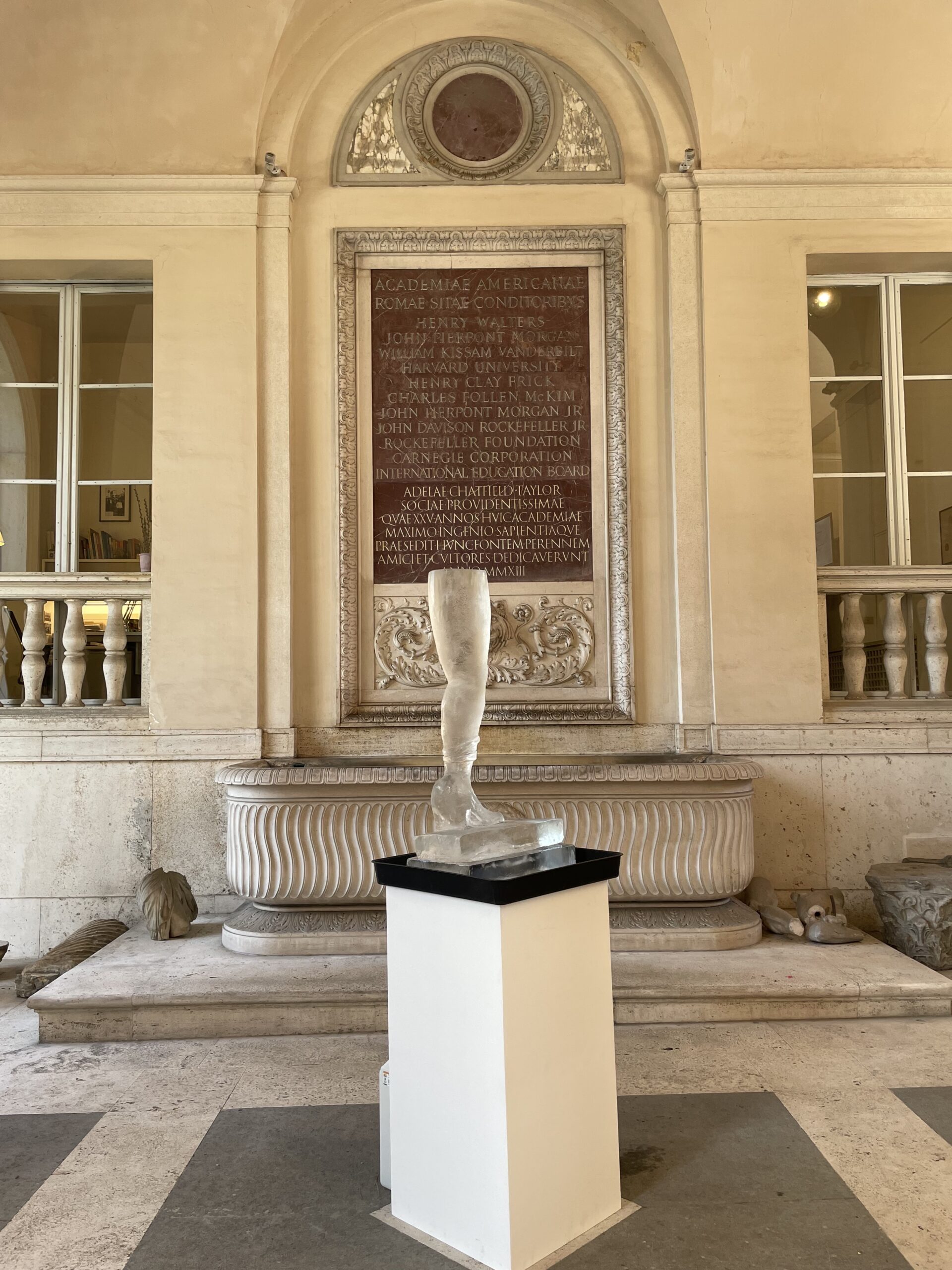 Further, drawing from our unique position as curators, Julia and I decided to raid Dikeou Collection and recreate a wonderful installation in the foyer of the Academy where much of the Archeological work was happening—with all the fragments and fountains and study tools . . . There, a leg in the form of an ice sculpture by Lizzi Bougatsos entitled Self-Portrait stood tall and wildly clear in its medium. An inherent vice by nature, the ice glowed among treasures from the ancient world, still giving and sharing their secrets. Self-Portrait is both a sculpture and a performance, which lasts about fours hours as the ice melts and eventually collapses on itself, culminating with the destruction of the leg, because that inherent vice would be painfully bad for the immediate surroundings. Julia did the honors.