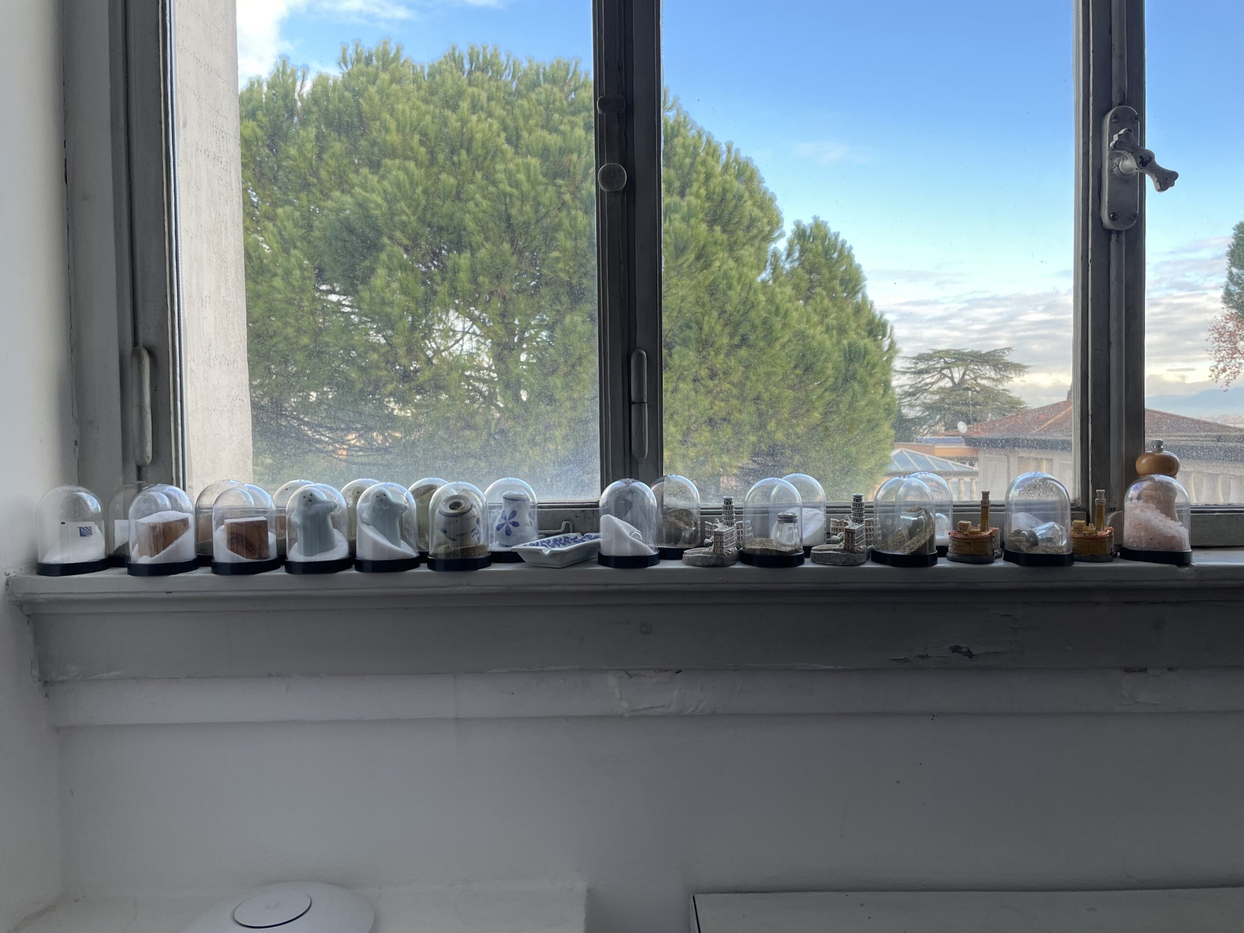 Devon Dikeou, Shake (Rome Prize), 1991 Ongoing, Installation View of Snow Globes Altered to Become Functioning Salt and Pepper Shakers, Each Filled with Salt and Pepper, and when Used, the Diminishing Salt and Pepper Reveals the Actual Accumulated Gift Collection of Shakers, 3 1/2”H x 2 1/2” in Diameter
