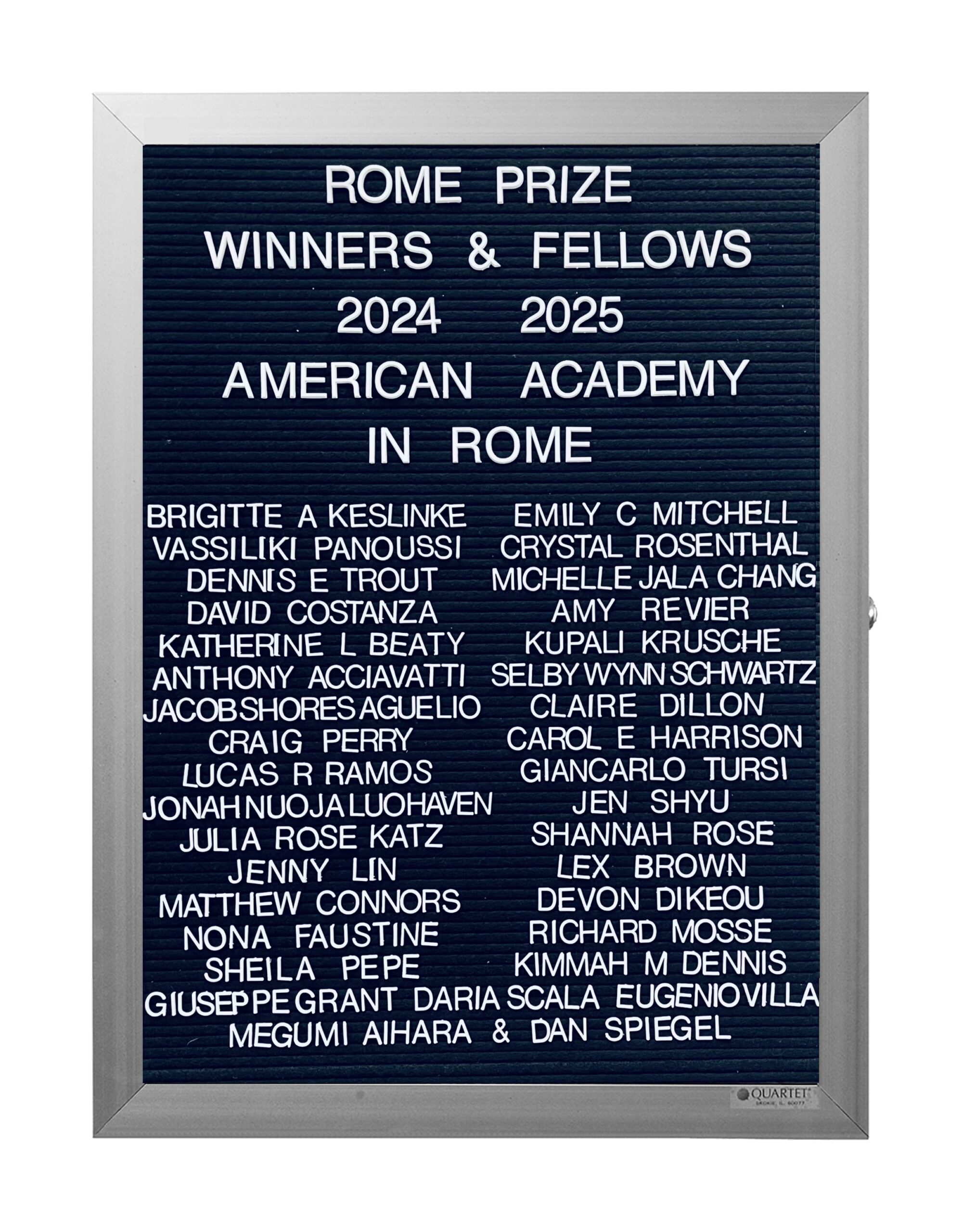 Perhaps the longest and most important collaboration, however, began in 1991 with my Ongoing series “What’s Love Got to Do With It?” Inspired both by the Pictures Generation and their use of appropriation and by my aspiration to exhibit in the storied Leo Castelli Gallery, I replicated that equally storied lobby directory board. The one I created sported the names, curators and dates of one of the first group shows in which I participated . . . I realized this board could not be the only one, so I created one for every group show since (about 160 now) plus the table of contents for each issue of zingmagazine, and Dikeou Collection acquisitions. My first proposal as Rome Prize applicant some 15 years ago was to recreate this series for all Rome Prize Winners . . . The first I made was for class of 2024/25. Ongoing . . .
