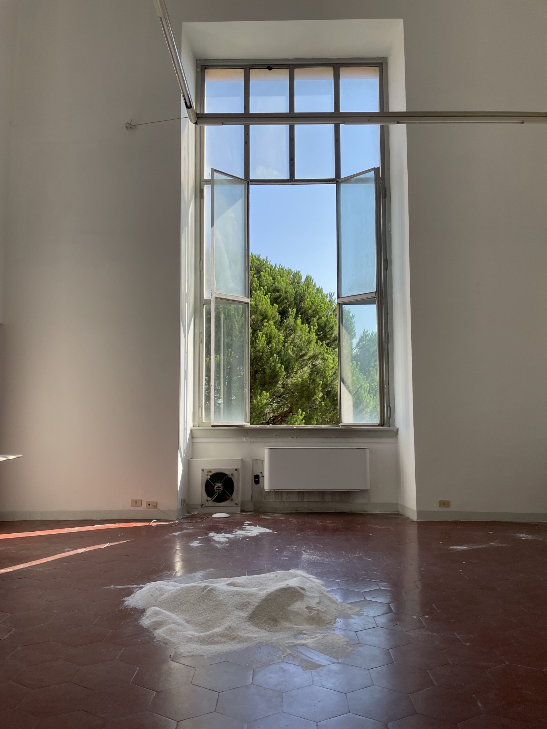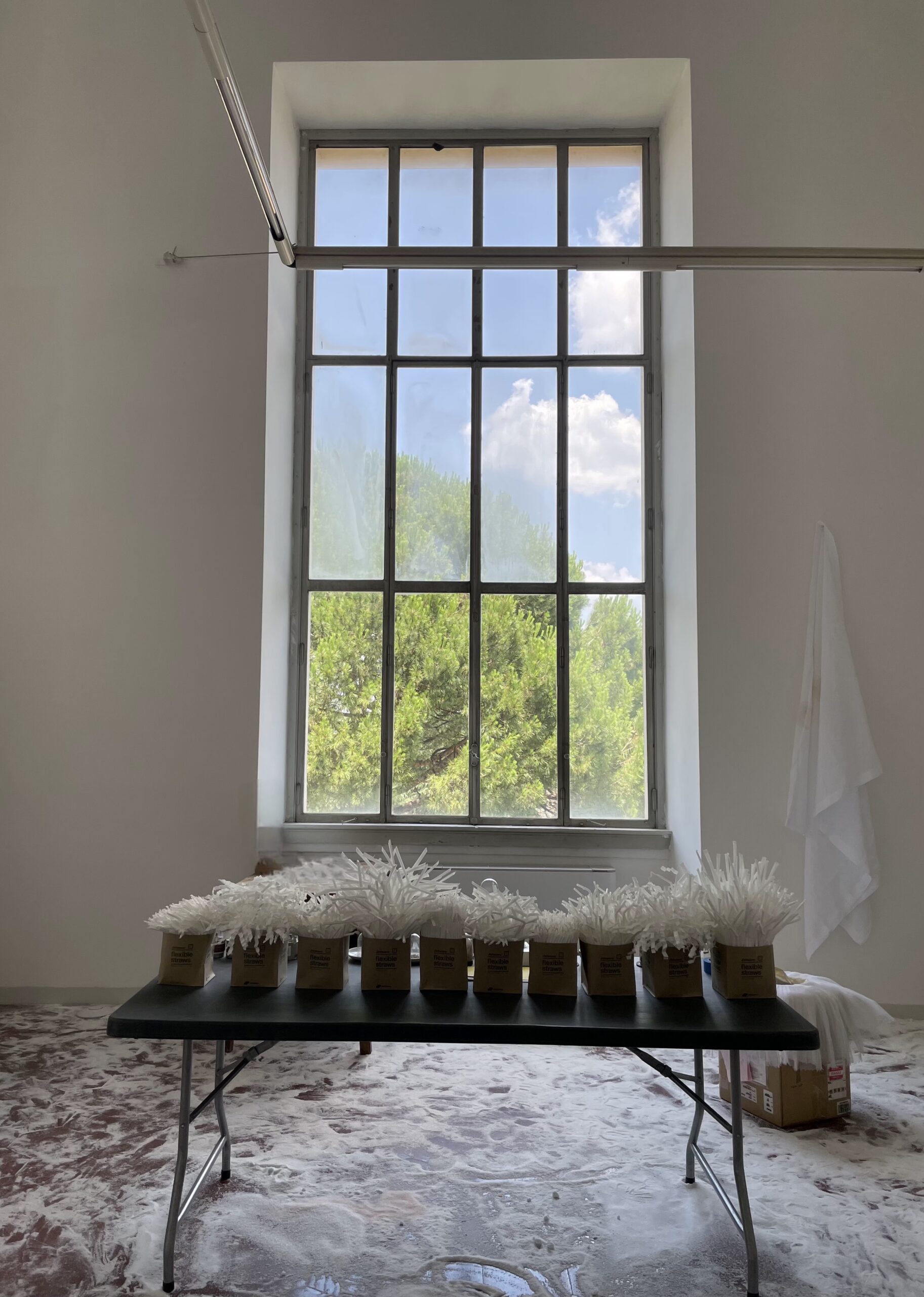 I affirm, and continue to argue, landscape can be anything . . . And I tried to make anything . . . Anything that could bridge these two canvases, two windows, two views, including a bunch of straws (Suck), an Ongoing piece of mine since 1991, that exists as a series of straw bouquets, usually used, but not in this edition . . . Straws can desolate our landscapes/oceans/planet, but here they just shimmer and shake against the mighty pine fluttering its way to majesty in the temporal wind. Look the other way towards the Aspen window for a landscape of another kind . . . No pleached elegance, but a futon covered in airplane blankets snagged by AAR Fellows and their Fellow Travelers, and visiting friends . . . It’s called Red Eye and rests underneath the Aspen window. And then there is the salt . . . decidedly spread all over the studio floor in mounds, in spatters, in the way perhaps snow looks and sometimes feels, and contrasts with the red terracotta floor, while the white artificial weather is a stand-in for Aspen snow . . . Funny, you put salt down to melt snow . . . It does look like a first snow on Main St or simultaneously the remaining days of Carthage . . .