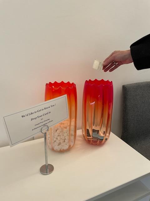 Plus, We’d Like to Get to Know You, placed in the Residential Life Office. Eventually, the lovely Titziana, one of a few who kept us caffeinated and more, picked the Grand Prize Winner out of all the business cards deposited into the American roadside tradition that was gussied up AAR style. The business card picked by Titziana from the Salviati vases belonged to AAR’s Arts Director, Ilaria Puri Purini’s, daughter. Is the fix in . . .