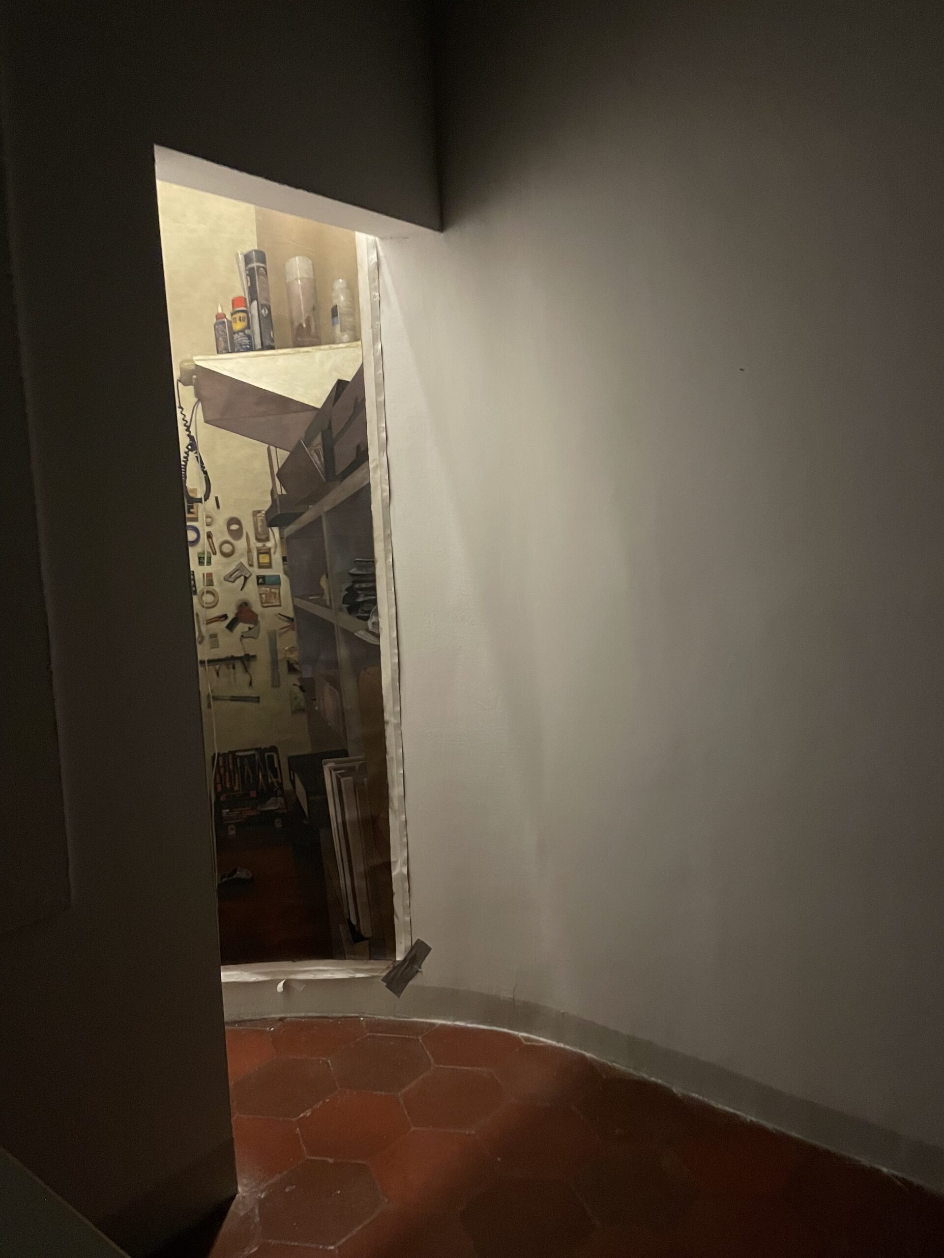Of course, the newest additions of The Niney Timeline, which chronicles the life and times of my security blanket, Niney, as she traverses the art world, including the McKim, Mead and White Building, while resting comfortably in her bedroom/our residence. A toilet paper piece, Entertaining is Fun, installed on the wall with toilet plungers in the WC. There’s Contrivance, a series of photo-realistic paintings of the tool rooms of the various non-studios I’ve had, including at other art residencies. It is a nod to the studio—an intervention that adds to the cycle. My AAR tool room was in the closet of my McKim, Mead and White Building studio. I displayed the photo-realist painting opposite the actual tool room in the nave of the entry, peeking out into the world of in-between windows and lands . . .