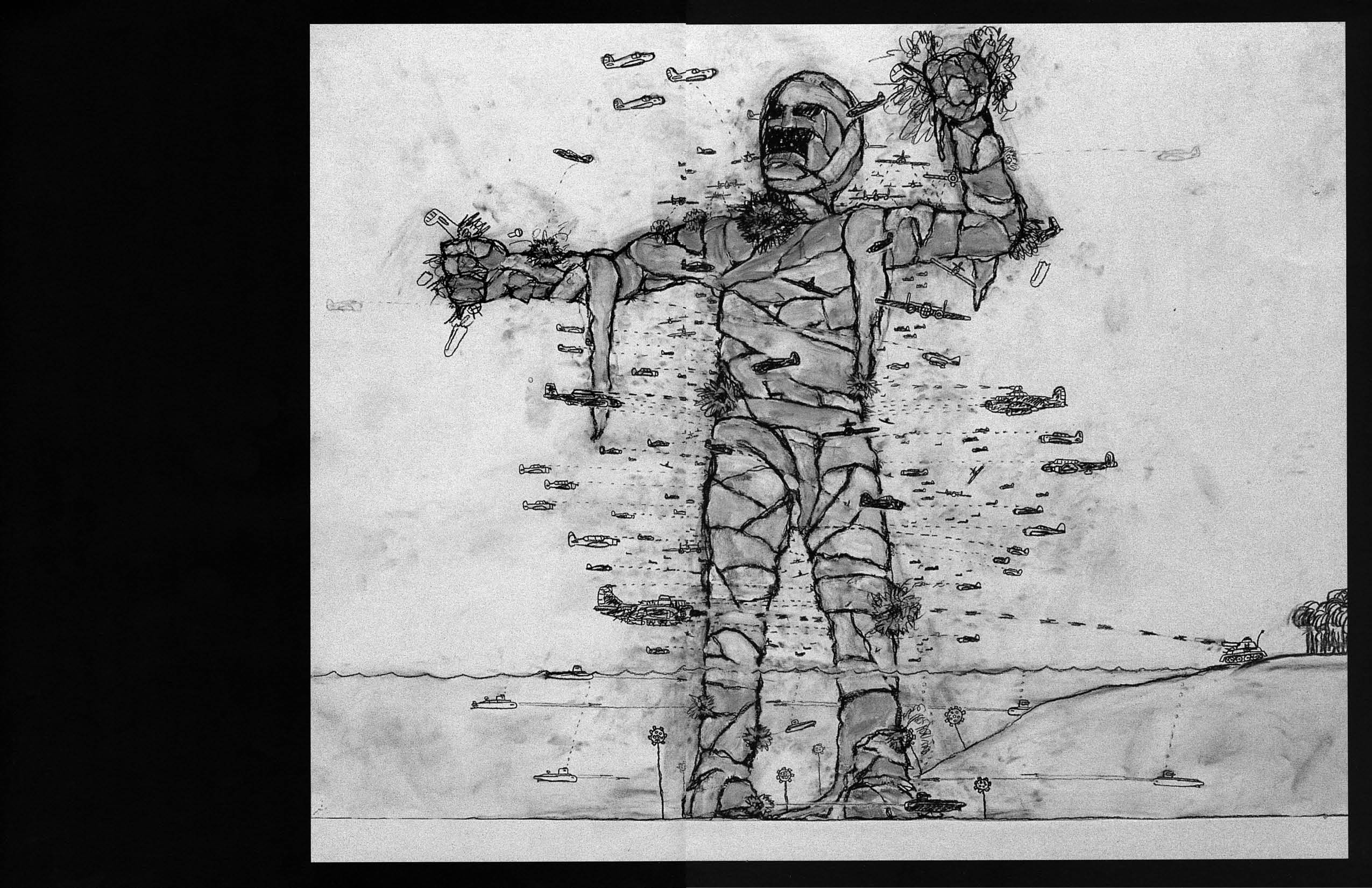 So if we are assuming “Airplanes & Mummies” operates the way a dream does, as a drama about the Self playing out on the stage of the unconscious, one interpretation is that the Shadow (Mummy) refuses to let go of past pain and allow itself to “die” so that the psyche can be reborn new. Airplanes represent Ego, which seeks to defeat the Shadow from limiting lofty ambitions and preventing change. This suggests that the Self is at war between the preserved past and the desire to move on. The artist has said in interviews that part of the work is of course the many interpretations that the audience projects onto it. But because what is depicted in the images is not actually random, because it is rising from somatic logic that the artist is tracking, it can make an intuitive kind of sense on sight that bears out conscious interpretation.